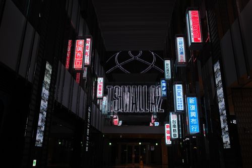 The design features fourteen LED screens arranged at varying heights on both sides of the atrium, reminiscent of vintage Taiwanese signage, with a transparent LED screen at the center to capture and focus attention.